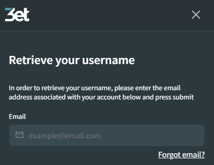 A retrieve your 3et email address window will open where you will be required to provide your account username, and your first name, last name, date of birth and country of residence.